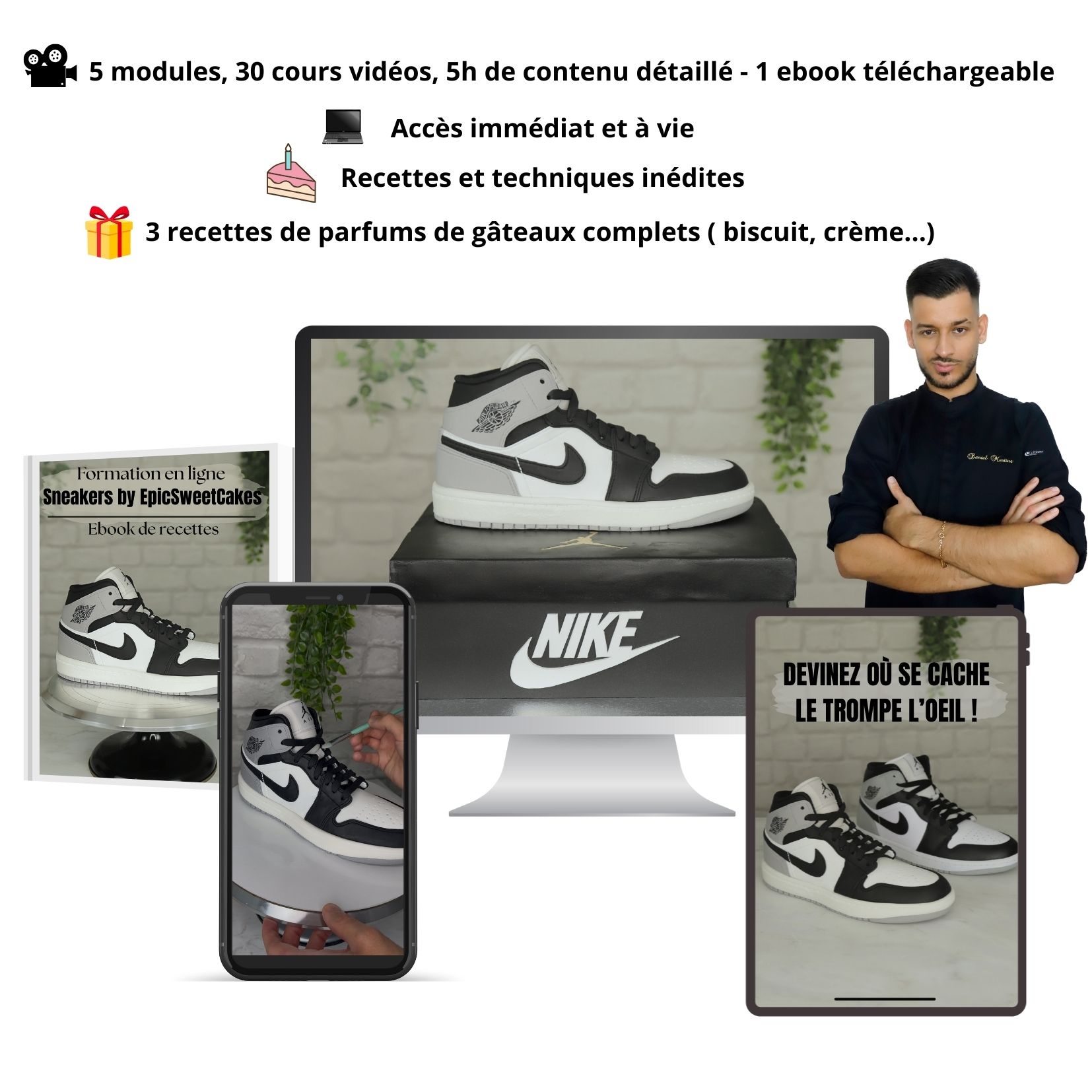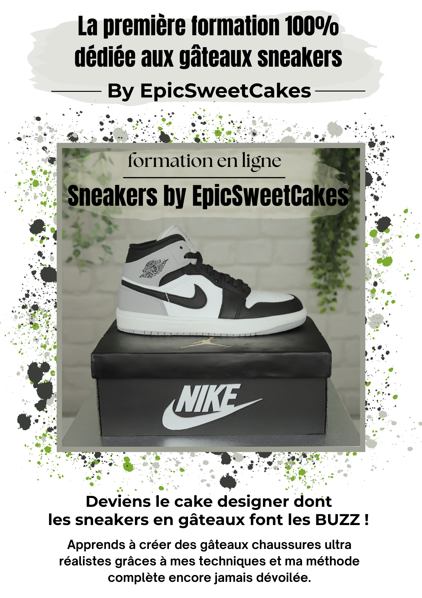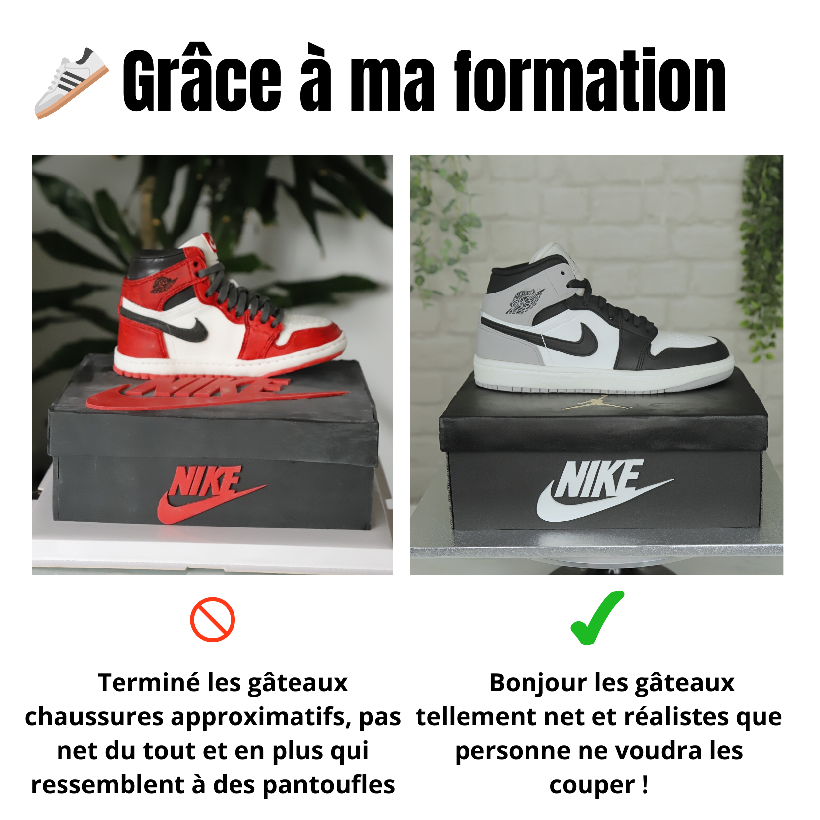 Pour cette formation, j'ai choisi de t'apprendre à réaliser le modèle "Air Jordan" non seulement parce que c'est le plus demandé auprès de tous les cake designer mais aussi parce qu'il regroupe énormément de techniques que tu pourras réutiliser pour reproduire n'importe quelle modèle de chaussure en gâteau.