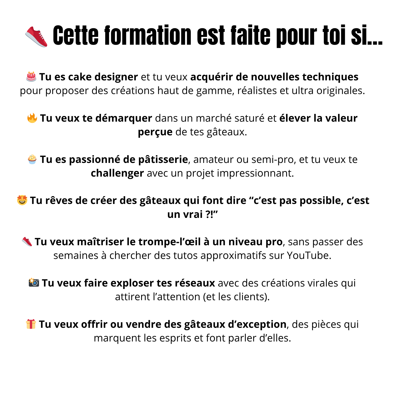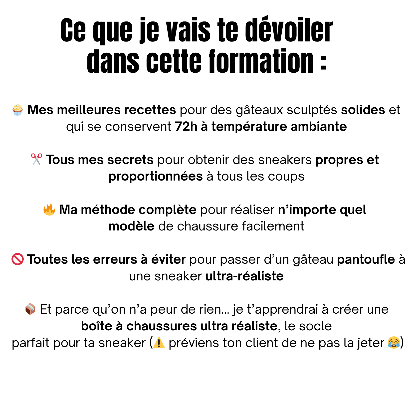 Tu auras accès à mes recettes, mes techniques exclusives et tous mes secrets pour faire la différence entre un gâteau "sympa"... et un gâteau qui fait dire "wow, c'est une vraie chaussure?!"