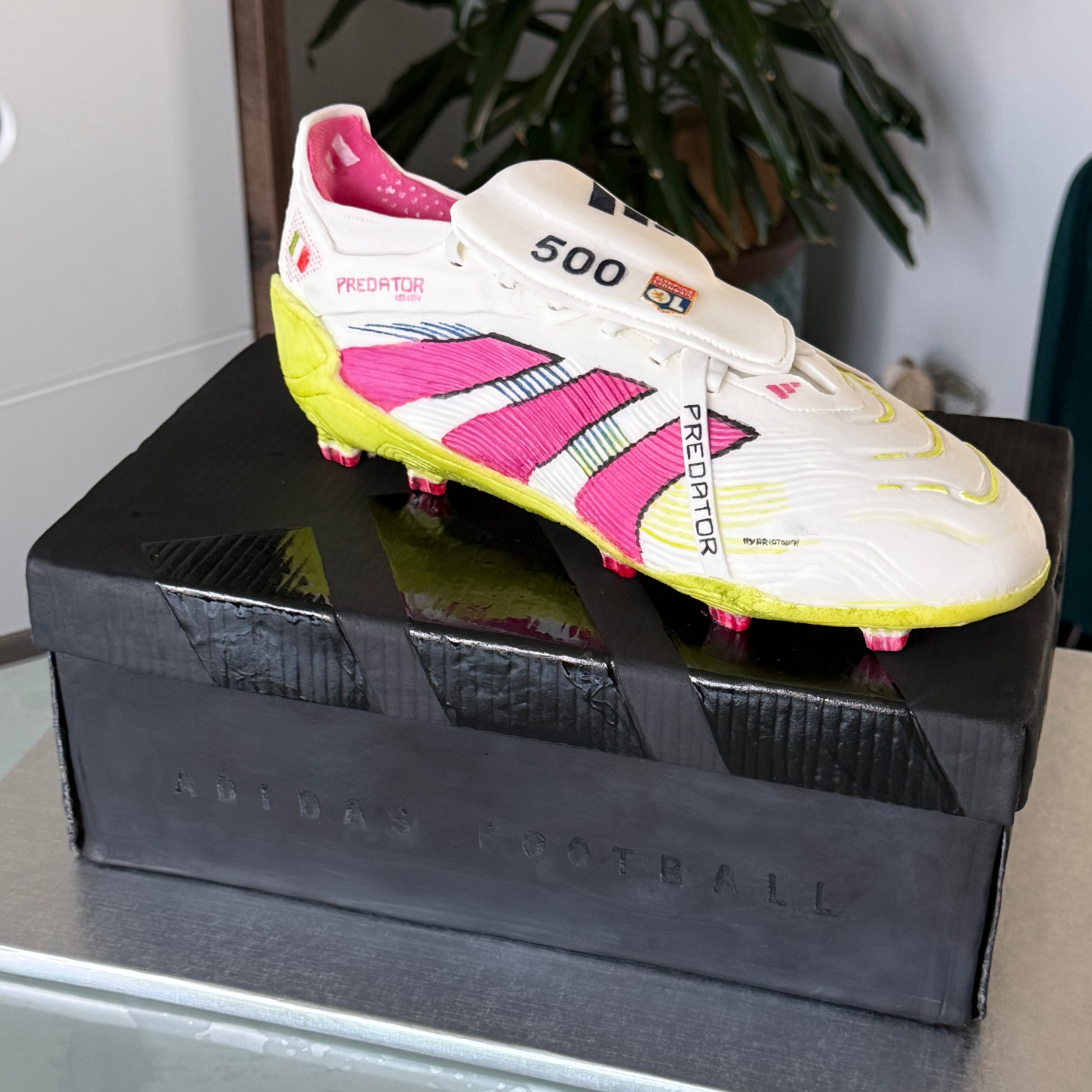 Pour célébrer l'anniversaire d'une célèbre joueuse de football, le siège Adidas me contacte pour reproduire un crampon en édition limitée en trompe l'oeil. Ce gâteau aura servi pour un tournage Adidas en interne.